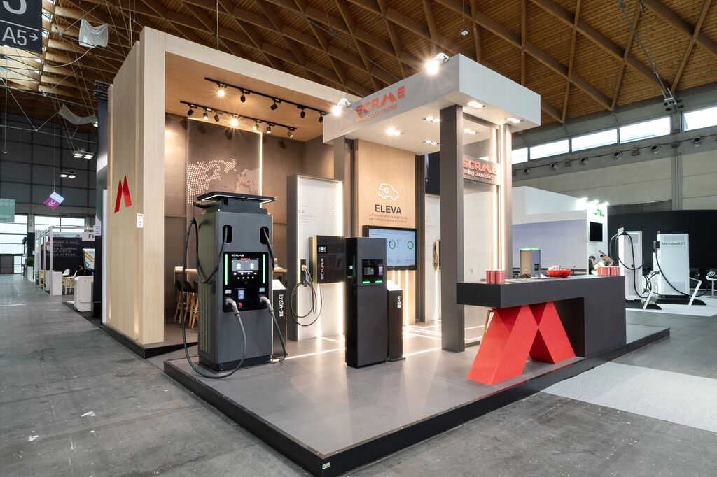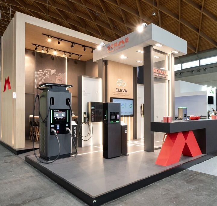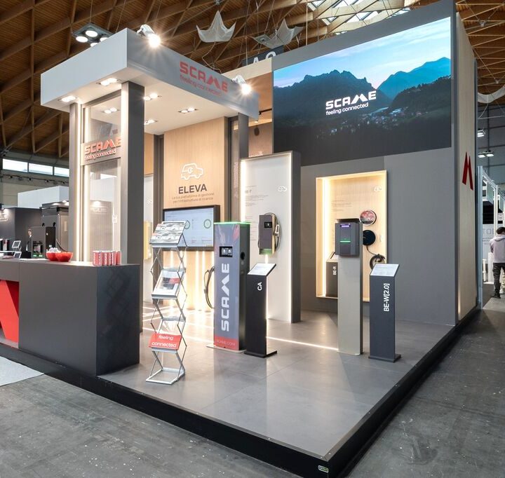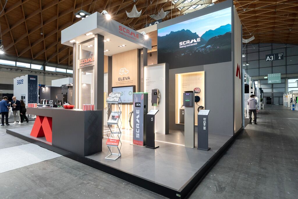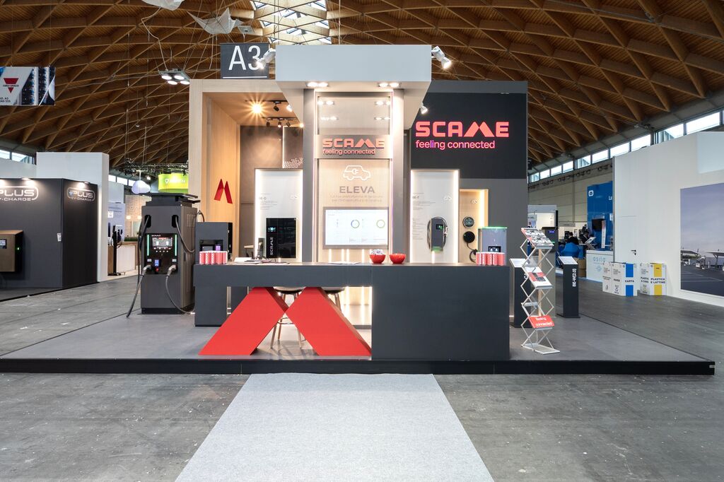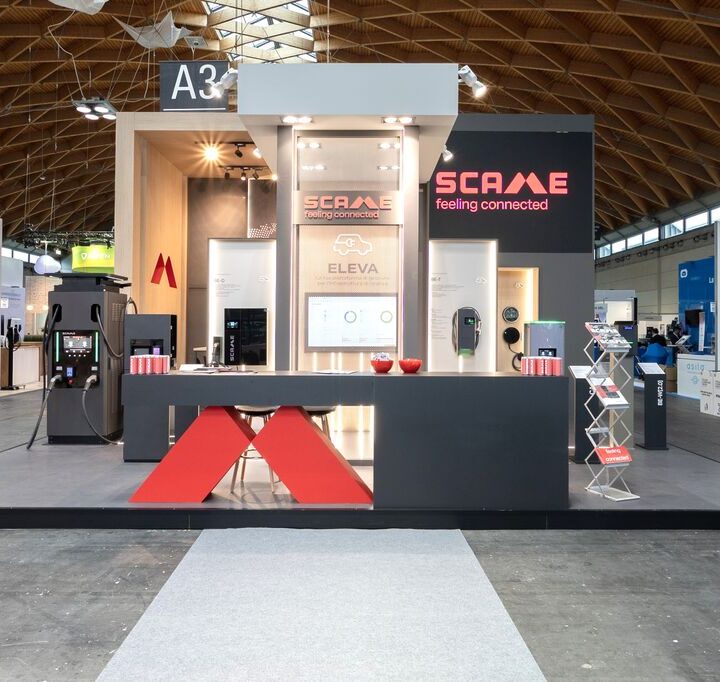 P Per Scame Parre Spa a Light+Building di Francoforte abbiamo sviluppato uno stand che parte dal concept realizzato per Key Energy e lo arricchisce con un nuovo elemento scenografico: una struttura sospesa in rete metallica che ospita il logo e diventa il segno distintivo dello spazio.