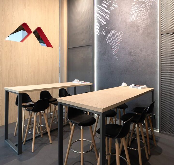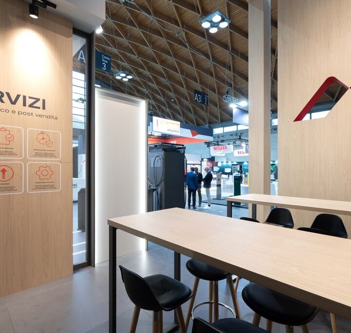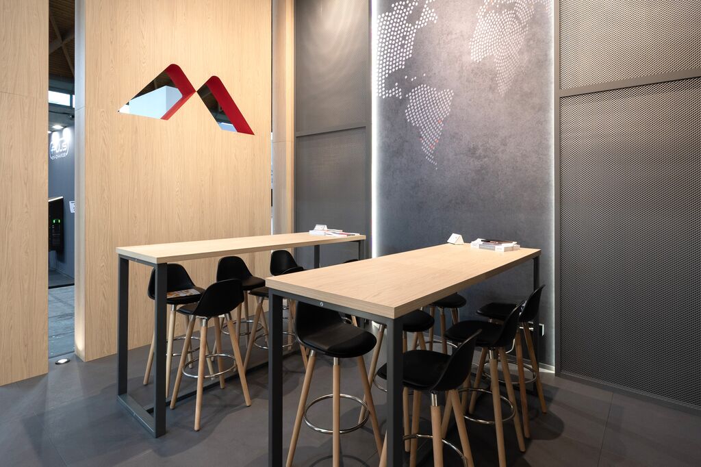 Anche in questo caso il progetto gioca sul contrasto tra materiali: laminato effetto rovere per dare calore all’ambiente espositivo e metallo per sottolineare l’anima tecnica del brand.